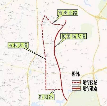 区域二:东起坂雪岗大道(含坂雪岗大道),西至五和大道(含五和大道),南起雅园路(含雅园路),北至雪岗北路(含雪岗北路)及其合围区域内道路。